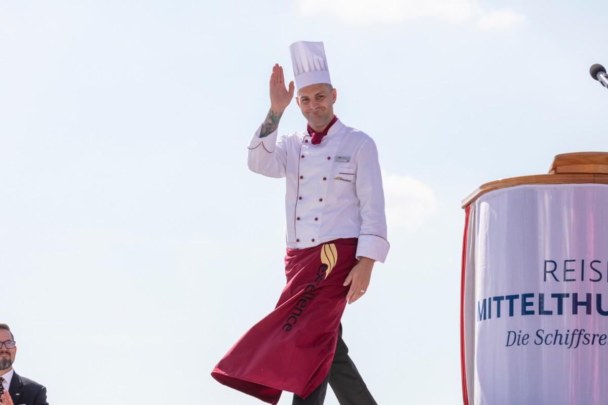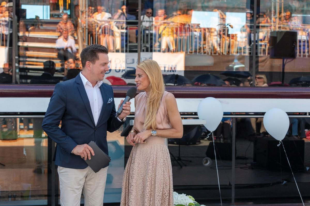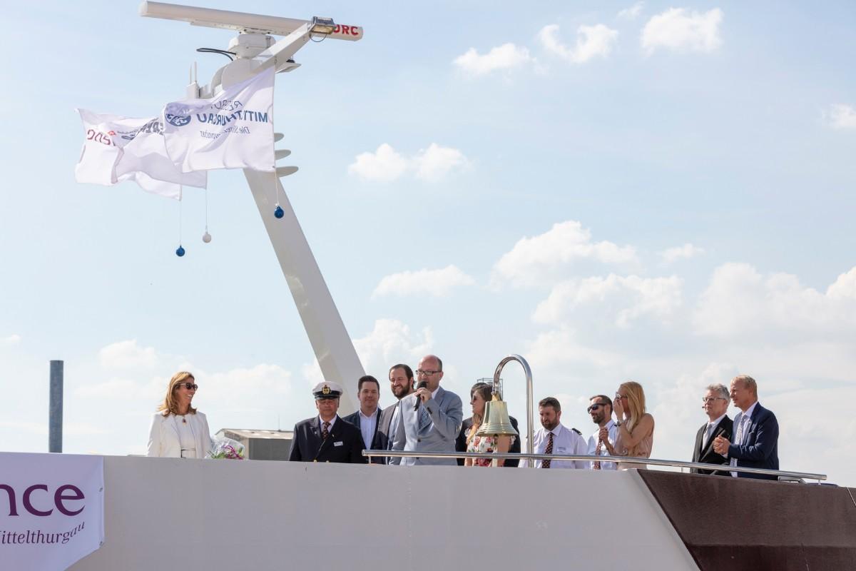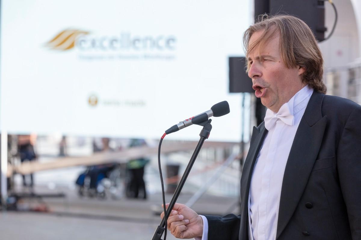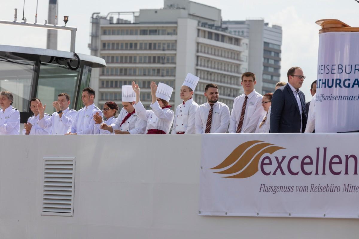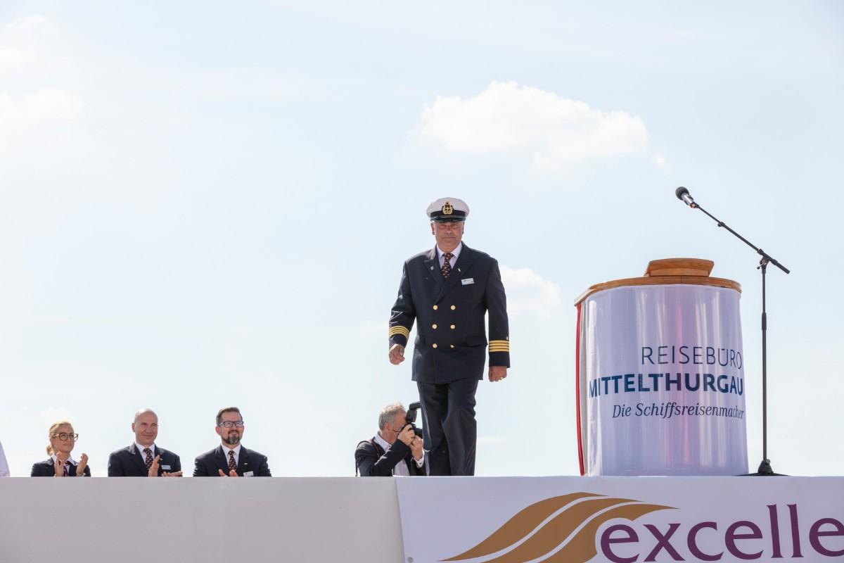 Pfarrer Felix Christ gab dem Schiff und seiner Besatzung Glück und Segen auf den Weg. Taufpatin war erneut die Excellence-Botschafterin Christa Rigozzi. Sie wünschte dem Schiff die traditionelle stete Handbreit Wasser unter dem Kiel und Sven Epiney führte gut gelaunt durch die Feier am Hafen. Zu den Höhepunkten der spektakulären Unterhaltungsshow gehörte der Auftritt des Berliner Baritons und Klangraum-Pioniers Burkhard von Puttkamer am Hafenkai, begleitet von Alina Pronina am Flügel. In begeisternder Weise wechselte Puttkamer am Ende ins Pop-Genre und doubelte Grossmeister Elton John. Impressionen von Puttkamers Schleusenkonzerten, die er exklusiv mit den Excellence-Schiffen in Schleusenkammern auf den Flüssen Europas durchführt, waren auf der Grossleinwand zu bestaunen, ebenso wie eine Videoproduktion, die den Bau des Schiffes und den Zeitdruck in der Teamco-Werft dokumentierte.